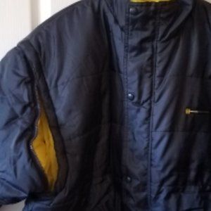 A classic jacket in a great brand, gorgeous navy exterior with beautiful bright yellow interior; zipper on sleeves as shown; good condition; no care tag, no size tag, see approximate measurements: