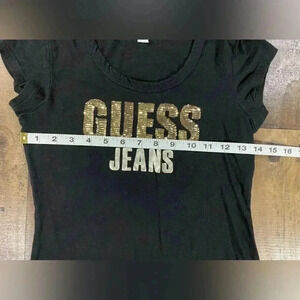 GUESS Jeans black t-shirt with gold writing and gold sequins in EXCELLENT condition! Scoop neck and cap sleeves in Size: M. Worn once!