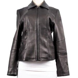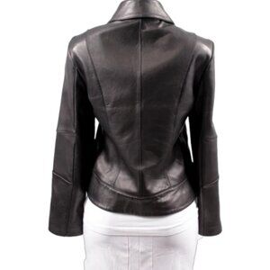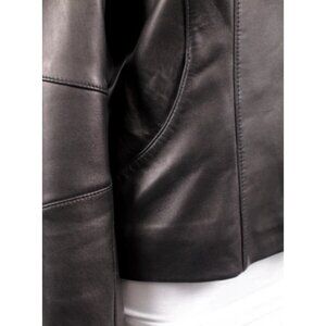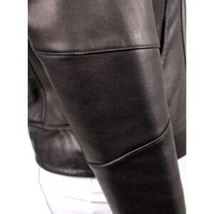 Black Guess leather jacket 2 pockets on front, one pocket zip closure inside and burgundy print lining with flower detail.