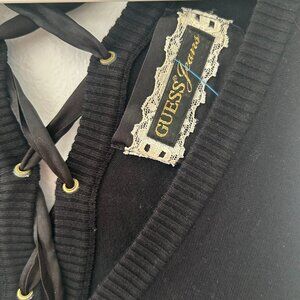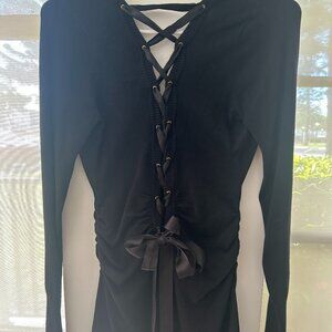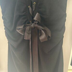 LITTLE BLACK DRESS. VERY SEXY FIT. ROUCHED SIDES, V NECK, BEAUTIFUL RIBBON LACED BACK. GOLD RIVETS AND GOLD TABS ON BOW. SIZE MEDIUM (CAN FIT A SMALL OR A MEDIUM).