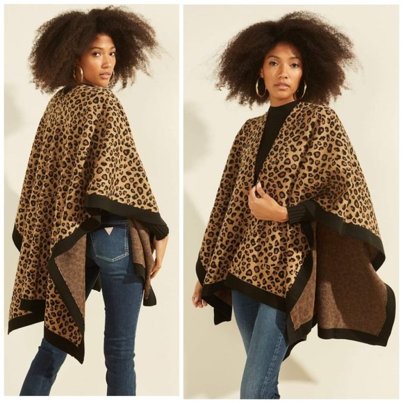 Perfect for laying, this knit ruana features an allover leopard print, open front, open sleeves and ribbed trim.