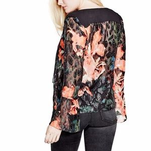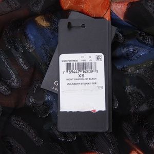 Sheer floral-print top, with a metallic jacquard design and tie neckline with stud embellishment. 100% Polyester. Hand wash. Condition: Storestock item. - may have been fitted in a store. #50/10