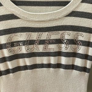 This long-sleeve sweater is soft and its body con material around the hips/ waist/ stomach. It definitely could fit a size Small.