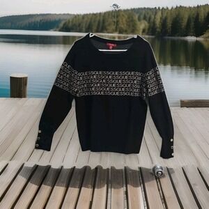 GUESS Los Angeles All Over Logo Print Sweatshirt Black XL Gold Buttons Preppy