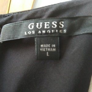 New with tags GUESS Los Angeles Jet Black " Flirty stone dress" size L with unusual diamond shape reflective embellishments at neck /chest area. 94% polyester 6% spandex . Measurements : armpit to armpit ~ 16.75" . From top of shoulder to bottom hem ~ 35.5". Please see above photos for what was measured. Thank you . Label direction say you can machine wash. Asymmetrical detail seam at lower 3rd of dress . Zipper and hook enclosure on the back of the dress