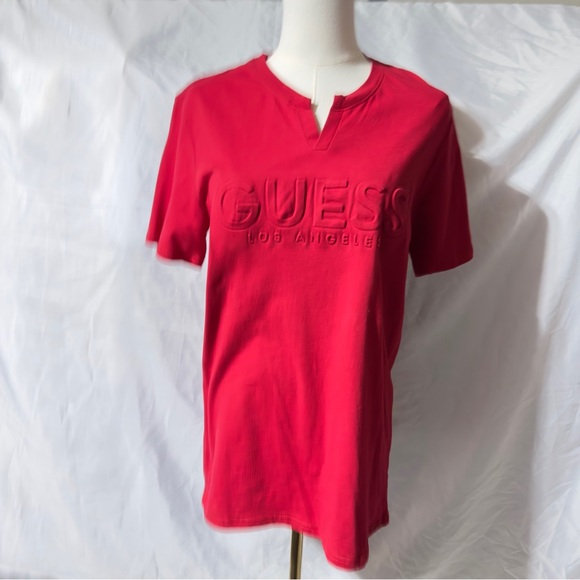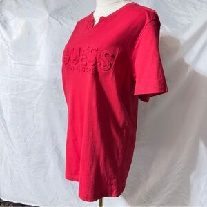 Stylish and modern GUESS Los Angeles short-sleeve t-shirt in a bold red color. Features a raised embossed GUESS logo across the chest and a unique split V-notch neckline for added detail. Crafted from a soft cotton-blend fabric for everyday comfort and style.