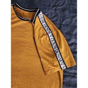 Step out in bold style with this GUESS Denim men's crewneck t-shirt in a vibrant mustard yellow. Designed with eye-catching GUESS DENIM logo tape detailing along the shoulders and a classic embroidered triangle logo on the chest.