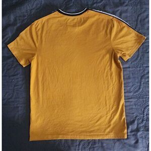 Step out in bold style with this GUESS Denim men's crewneck t-shirt in a vibrant mustard yellow. Designed with eye-catching GUESS DENIM logo tape detailing along the shoulders and a classic embroidered triangle logo on the chest.