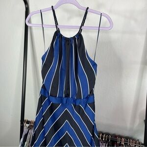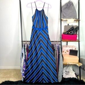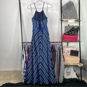 GUESS Los Angeles Navy Blue Chevron Stripe Criss Cross Nautical Satin Maxi Dress
