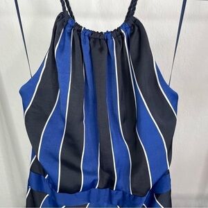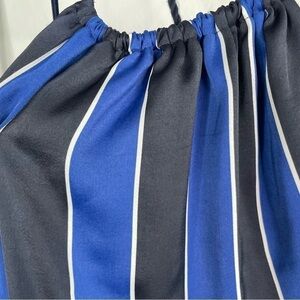Size 6. Navy, blue, and white stripes. Adjustable navy rope lace up cord strap. Waist and bust can have a bit more room than measured if you adjust the cords.