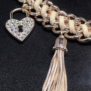 Condition: Boutique new Material: Gold-tone metal & faux leather Design: Chain with tassel, GUESS tag, and gemstone charm