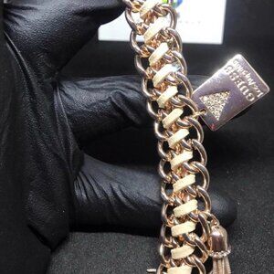 Add a touch of edgy style with this brand new GUESS necklace, featuring a bold gold-tone chain intertwined with cream faux leather braiding. Finished with a tassel charm, a sparkling GUESS Los Angeles tag, and a gemstone accent, this piece blends fashion-forward design with signature branding.