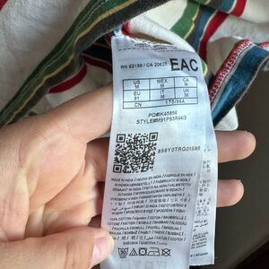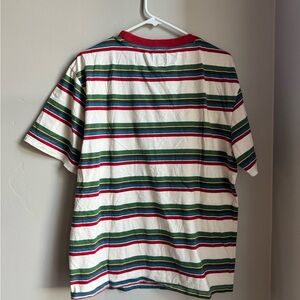 Features classic multicolor horizontal stripes, contrast red ribbed collar, and soft cotton feel.