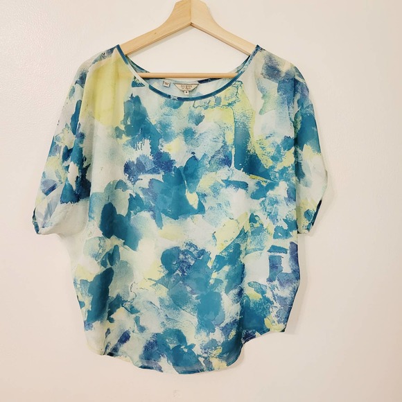 GUESS Los Angeles blue, yellow and white short sleeved sheer watercolor print blouse. Size medium. If you look close on the front of the fabric, you can see a small white line, but you have to look hard to find it. Otherwise in excellent preowned condition.