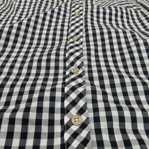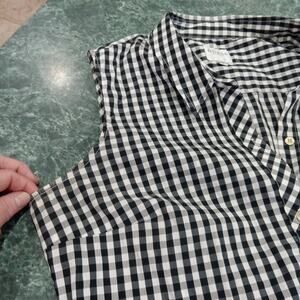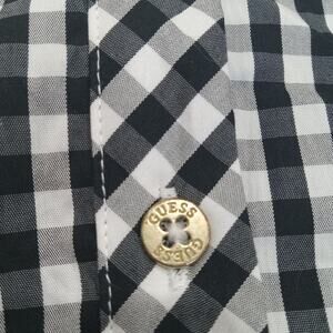 The GUESS Los Angeles Women's Size Large Sleeveless Buffalo Check Top in Black and White is a stylish blouse perfect for casual occasions. Made of lightweight and breathable polyester material, this collared top features a button closure and the iconic GUESS logo accent. The black and white check pattern adds a classic touch to the regular fit design, making it a versatile piece for the summer and spring seasons. Ideal for women who appreciate a blend of bohemian and preppy styles in their wardrobe.