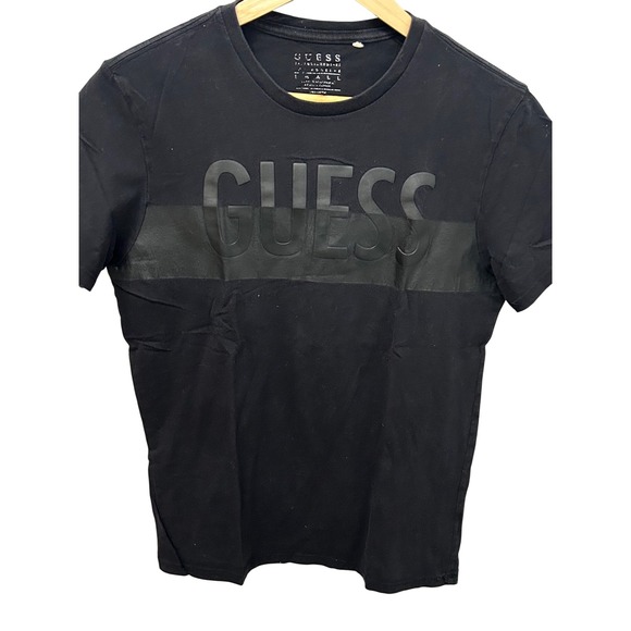 A black short sleeve crew neck t shirt from GUESS for men. This tee features a prominent embossed GUESS logo across the chest, set against a horizontal stripe detail. The design is clean and modern, making it a versatile addition to any casual wardrobe. Perfect for everyday wear or a relaxed weekend outing.