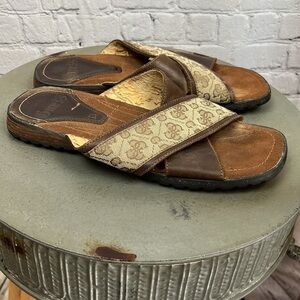 GUESS Men’s Criss Cross Sandals, Leather & Monogram Fabric Size 11.5