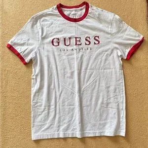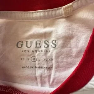 Classic GUESS tee with red trim. Soft fabric. Ideal for casual outings.