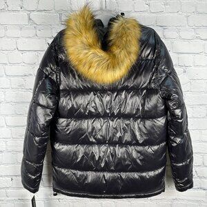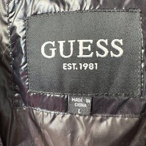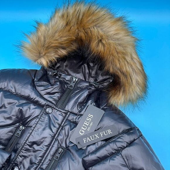 GUESS Men's Women's Unisex Insulated Mid-Weight Faux Fur Hooded Puffer Jacket Coat, Black in Color with Brown Fur, Style 112AN335, Puffer Product Material: 100% Nylon Lining: 100% Polyester.