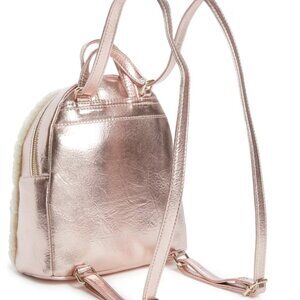 Elegant GUESS backpack in metallic rose. Features plush trim and compact design. Ideal for stylish outings.
