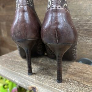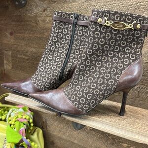 GUESS Monogram Brown Pointed-Toe Heeled Ankle Boots – Size 8.5