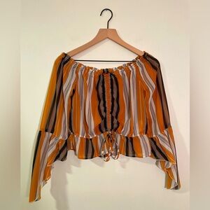 Features off the shoulder, center ruching option to make it more of a crop top if preferred and amazing bell sleeves.