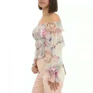 This crinkled chiffon top will add a romantic touch to your ensemble thanks to its all-over flower design, off-the-shoulder neckline, long sleeves with ruffle trim, and elastic inserts at the bodice.