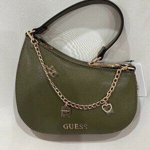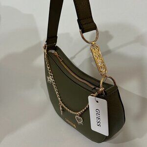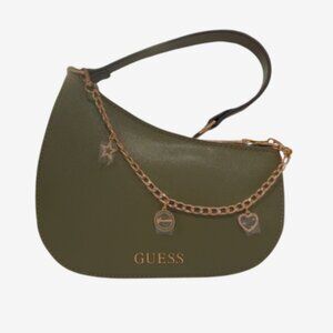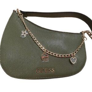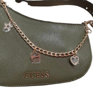 The GUESS Olive Green Shoulder Bag is a stylish medium-sized purse handbag with a classic designer logo pattern on the exterior. Made of polyester with gold hardware accents, this shoulder bag features a zip closure and an olive green handle/strap. The interior is lined with polyester and includes a bag charm accessory. Perfect for women who appreciate a blend of sophistication and style, this handbag is a versatile accessory for any outfit.