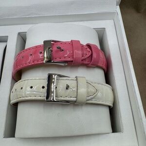 ♡Band Style:Genuine Leather Bands, One is a Gloss Bubble Gum Pink, One is Gloss Black, and the other Gloss White. There is slight cracking on the edges of some of the Bands in the Box just from Years of sitting in The Same Position, Doesn't Affect the Wear. Easy to Transfer Depending on The Mood
