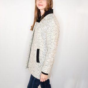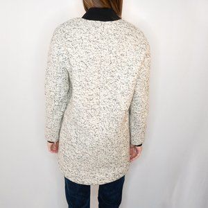 Description: Guess oversized boucle jacket in white and black marled color creating a gray look. With black trim.