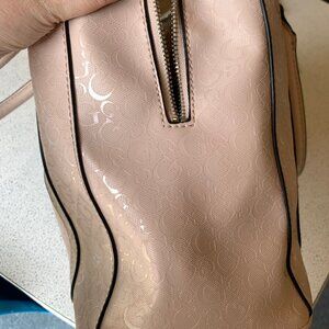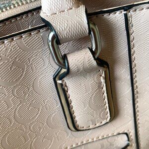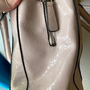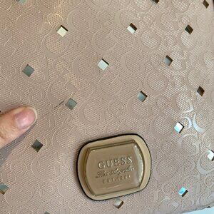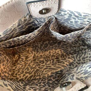 -pale pink faux patent leather with silver cutout detail on the front, Guess logo pattern throughout, silver hardware, cream/grey leopard fabric interior