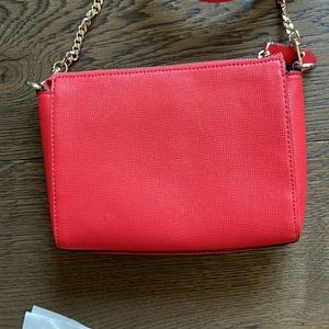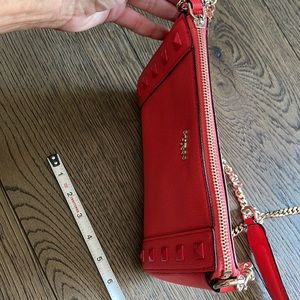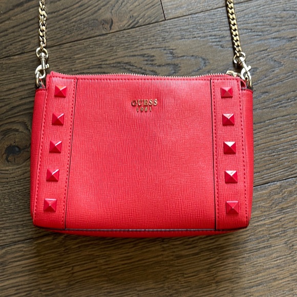 This gorgeous bag is the prettiest bright coral red color with studded detail on front in great condition. Gold metal strap chain is removable, making this purse even better with being able to add other fun strap types. Excellent condition! Can be worn as a crossbody or shoulder bag.