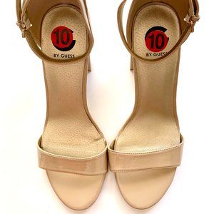 GUESS Patent Block High Heel Sandal with Ankle Strap Cream Beige Neutral Size 10