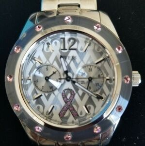This silver guess watch is pretty in pink! There is a crystal pink ribbon on the face and tiny pink crystals around the outer rim. This watch is beautiful and brings awareness to the cause. Gently used. Good Condition! Minor scratches and/or scuffs on band from normal use. No major flaws. Battery works at current time of listing. **May or may not need a battery by time of purchase**