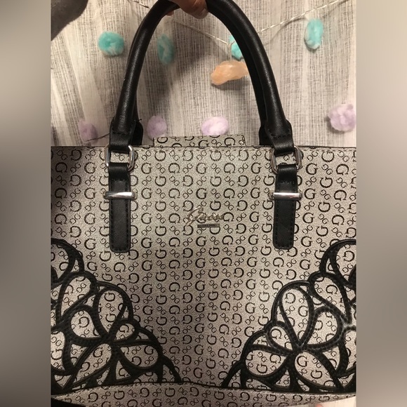 Cute Black and grey guess purse! This is a every day kind of purse, with a change holder in the middle of two big pickets.It doesn’t have over the shoulder straps, but you could order some if you would like!