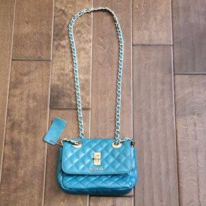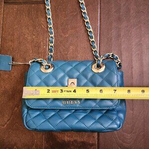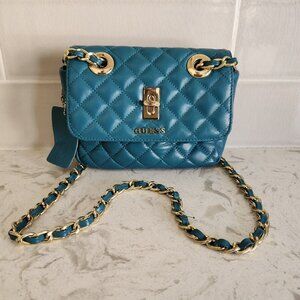 Featuring a spacious interior with a matching green lining, this bag is designed to keep up with your busy lifestyle. With a durable and stylish quilted finish, this GUESS bag is the perfect addition to any outfit. Don't miss out on this must-have accessory for any fashion-forward woman.