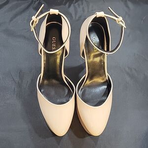 Synthetic outsole Approx. 1.97" covered platform height Approx. 5.91" covered stiletto heel pointy-toe adjustable buckle closure straps GUESS was established in 1981 by the Marciano brothers, who left the south of France in pursuit of the American dream. GUESS quickly became a symbol of a young and adventurous lifestyle. Throughout the decades GUESS invited people to dream with its8 iconic and timeless advertising campaigns that turned unknown faces into famous models.Today, GUESS is a truly global lifestyle brand with a full range of denim, apparel and accessories offered in over 80 countries around the world. THIS ITEMS IS BRAND NEW WITH TAG CHECK THE PICTURES