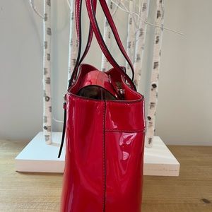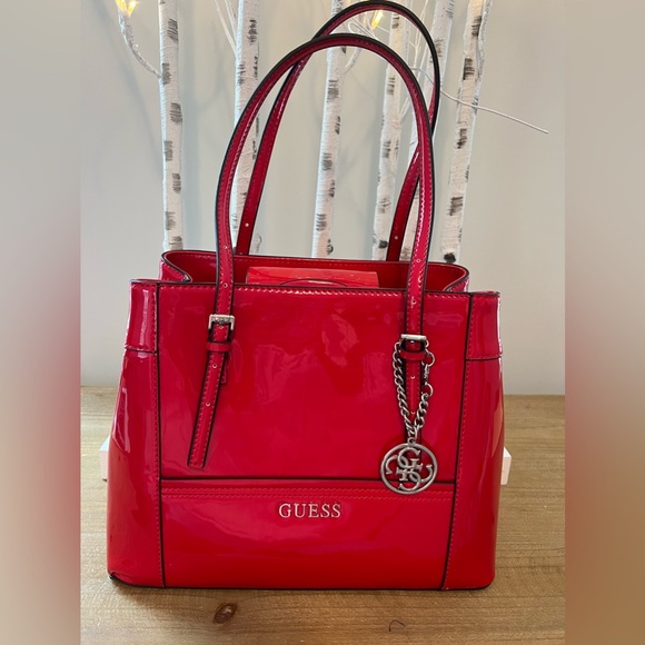 NEW RED BEAUTIFUL “GUESS” PATENT LEATHER HANDBAG. 10” TALL AND 13” WIDE.