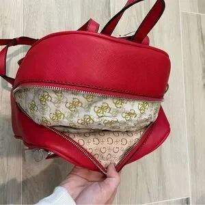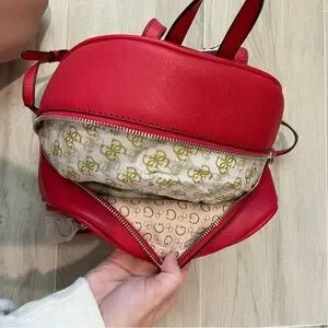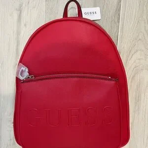 New with tag GUESS backpack. Red with a tan interior and silver hardware. Approximate dimensions: 12 inches tall, 10 inches wide, 6 inches deep