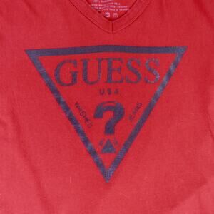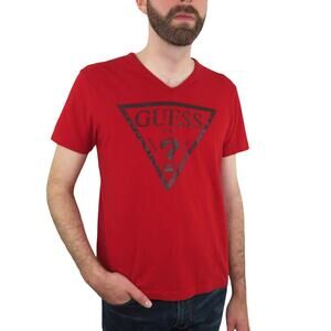 GUESS Red Logo V-Neck T-Shirt Men's Medium Graphic Tee Casual