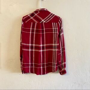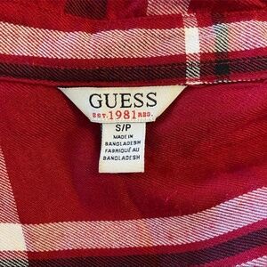 GUESS. Size small. Red, white, & black plaid button down shirt. Lightweight knit material. Long sleeves. Double breast pockets. Excellent used condition with no signs of wear. Bust: 19.5 inches. Length: 26 inches. ALL MEASUREMENTS ARE TAKEN WITH ITEM LAYING FLAT. 100% rayon/viscose. ||5722||
