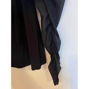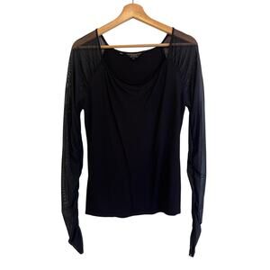 GUESS top with sheer mesh sleeves featuring ruched detail. Women’s size large. Excellent pre-owned condition. Soft nylon/spandex blend, comfortable, lightweight. Perfect for preppy, avant garde, whimsigoth, and going out styling.