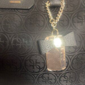 This cute Guess bag is perfect for the fall season, this bas is large enough to hold all of your essentials, (Measurements--LT-14 x HT-10X D-5). Bag features inner pockets and divers (3 compartments), with 3 zip compartments, and one outer zip compartment. This bag has lots of storage space. The color Black makes it versital, and pairs well with any outfit. The bag has a bag charm.