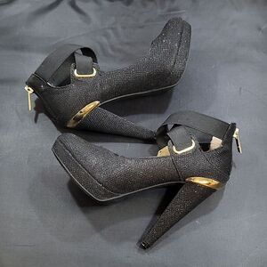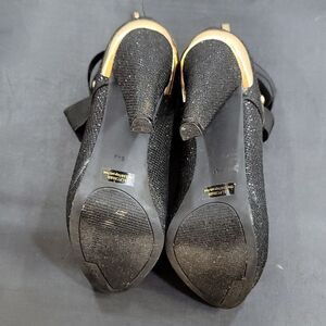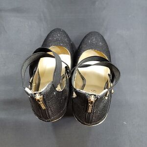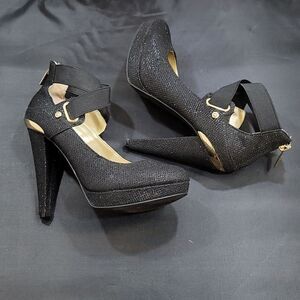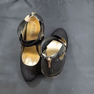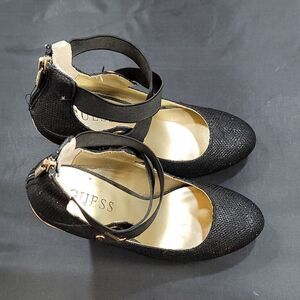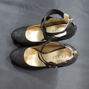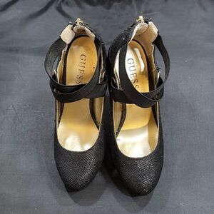 GUESS SHIMMER GLITTER CRISS-CROS STRAPS HIGH HEEL STILETTO PUMP SIZE 6M COLOR BLACK ROUND TOE BACK ZIPPER CLOSURE MADE WITH ALL MAN-MADE MATERIALS LINING BALANCE MAN MADE CUSHIONED FOOTBED INSOLE HEEL HEIGHT MEASUREMENTS APPROX 5"INCHES THIS ITEMS IS PRE-OWNED EXCELLENT CONDITION WITH ONLY LIGHT SIGNS OF WEAR IF ANY CHECK THE PICTURES
