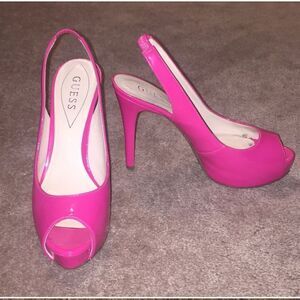 GUESS SLINGBACK PEEP TOE HIGH HEEL STILETTOS PUMP SIZE 9M COLOR HOT PINK ADJUSTABLE BUCKLE ANKLE STRAP MADE WITH ALL MAN MADE MATERIALS HEEL HEIGHT MEASUREMENTS APPROX 4"INCHED THIS ITEMS IS PRE-OWNED EXCELLENT CONDITION WITH ONLY LIGHT SIGNS OF WEAR IF ANY CHECK THE PICTURES