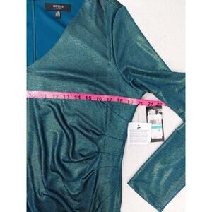 GUESS SZ 16 XL Plus teal gold textured vneck long sleeve ruched dress NWT B137