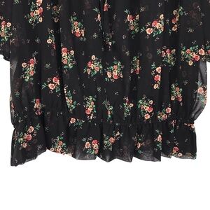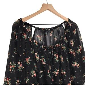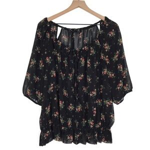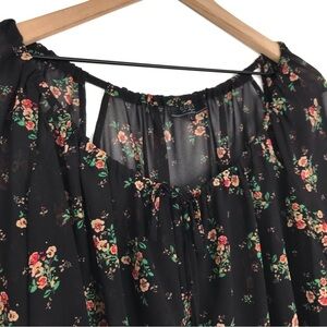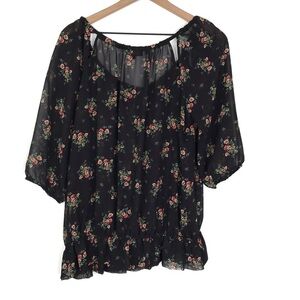 GUESS Sheer Floral Peasant Blouse Top. Drawstring scoop neckline. 3/4 Lenght sleeves. Cut out detail on shoulders. Elastic waistband. 100% Polyester. Hand wash.