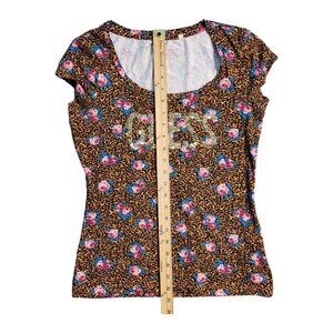 GUESS Short Sleeve Top Women's Size Medium Leopard Floral Print Sequin Gold Logo