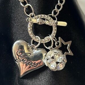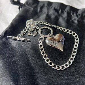 GUESS Silver Dangle Logo Heart Charm Chain Toggle Bracelet