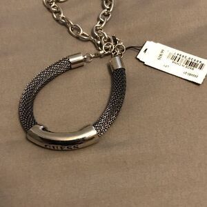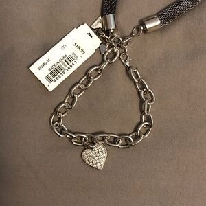 Stylish GUESS bracelet with a silver heart charm. Features a unique black mesh design. Ideal for any occasion.